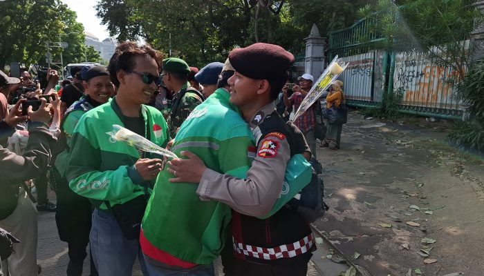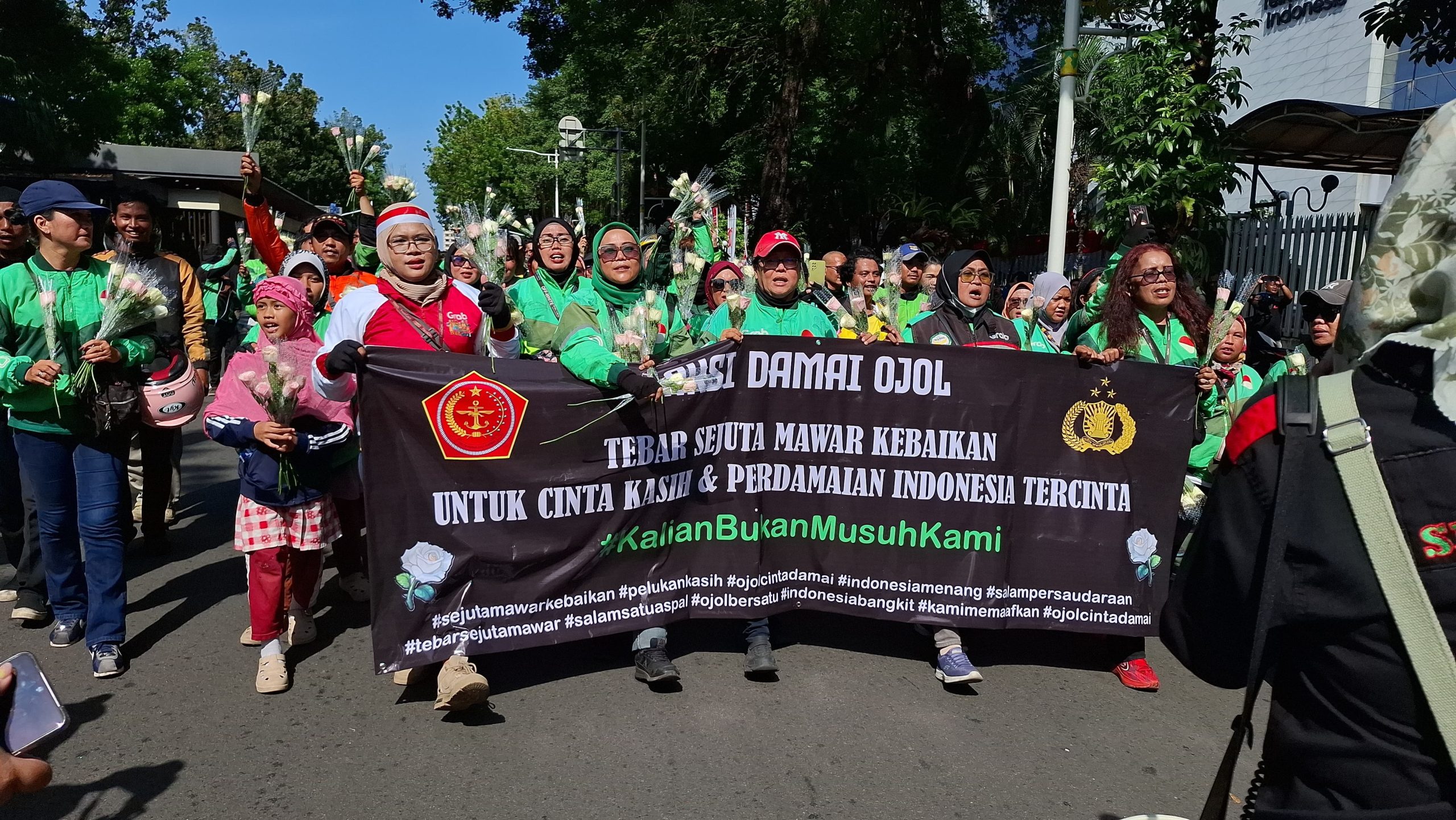 Jakarta – Ribuan pengemudi ojek online (ojol) menggelar aksi damai dengan membagikan 2 ribu bunga mawar kepada Anggota Polri dan TNI di kawasan Monas, Jakarta Pusat, Selasa (2/9) siang. Aksi ini dilakukan sebagai simbol perdamaian sekaligus upaya meredam potensi kerusuhan dan aksi anarkistis.