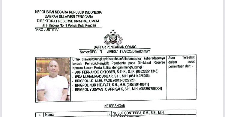 Portal.id, KENDARI – Kasus dugaan penipuan yang melibatkan Yusuf Contessa Kuasa kembali jadi sorotan. Yusuf telah ditetapkan sebagai tersangka oleh Kepolisian Daerah (Polda) Sulawesi Tenggara (Sultra). Namun, ia melarikan diri hingga berstatus Daftar Pencarian Orang (DPO) dan sampai sekarang keberadaannya belum diketahui aparat.