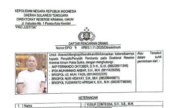 Yusuf Contessa diketahui telah masuk dalam Daftar Pencarian Orang (DPO) Kepolisian Daerah Sulawesi Tenggara, sebagaimana tertuang dalam surat DPO Nomor: DPO/3/I/RES.1.11/25/Ditreskrimum.