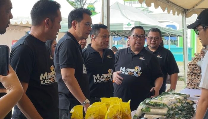 Rombongan Wakil Ketua Umum (Waketum) Koordinator Bidang Hukum Kadin Indonesia, M. Azis Syamsuddin, yang didampingi Ketum Kadin Sultra Anton Timbang meninjau langsung lapak-lapak pedagang di pasar murah tersebut. Foto: Portal.id.