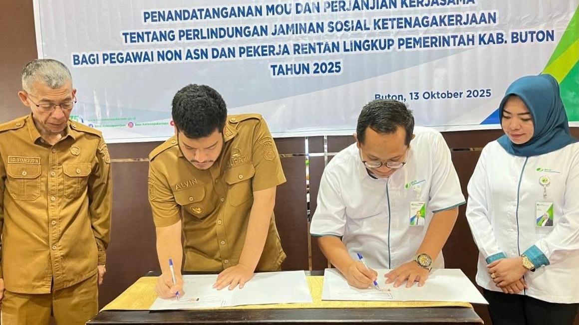 Portal.id, BUTON – Pemerintah Kabupaten (Pemkab) Buton Badan Penyelenggara Jaminan Sosial (BPJS) Ketenagakerjaan menandatangani nota kesepahaman dan perjanjian kerja sama terkait perlindungan jaminan sosial bagi pegawai non ASN dan pekerja rentan, Senin (13/10/2025).
