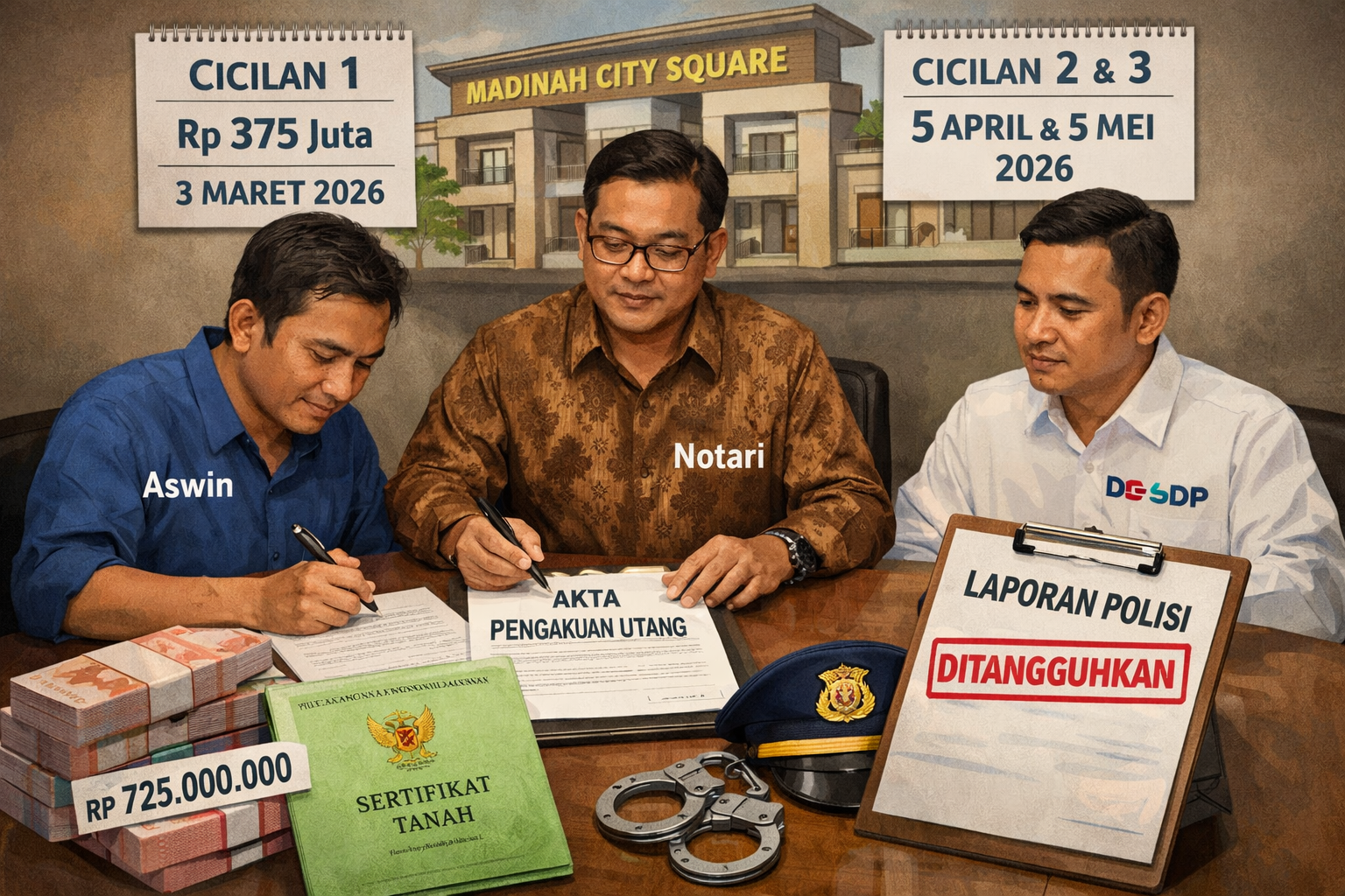 Kesepakatan itu dituangkan dalam akta pengakuan utang yang dibuat di hadapan notaris, dengan jaminan sertifikat tanah di Madinah City Square I.