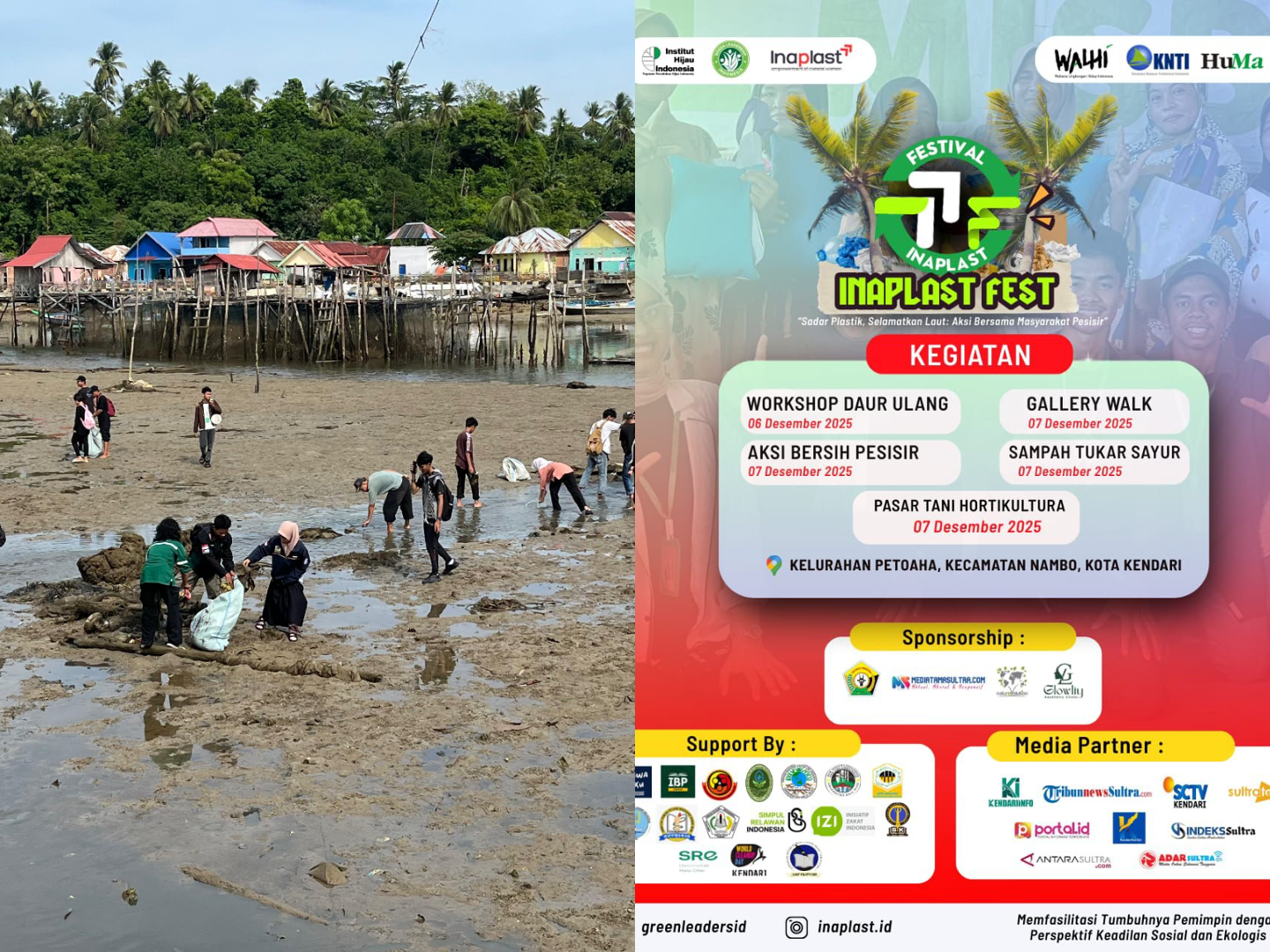 Portal.id, KENDARI – Inaplast Festival yang berlangsung di Kelurahan Petoaha, Kecamatan Nambo, Kota Kendari, Sulawesi Tenggara (Sultra), mengampanyekan kepedulian lingkungan melalui rangkaian kegiatan aksi bersih dan workshop daur ulang. Festival yang berlangsung pada 6 – 7 Desember 2025 ini merupakan proyek akhir Green Leadership Indonesia (GLI) Batch 5 yang diselenggarakan oleh Institut Hijau Indonesia.
